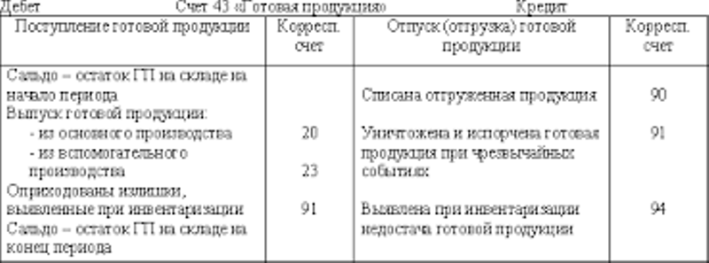 По кредиту счет 43 корреспондирует со счетами производств (20, 23, 29), материалов (10), общепроизводственных, общехозяйственных и коммерческих расходов (29, 26, 44), брака в производстве (28), отгруженных товаров (45), расчетов – с дебиторами и кредиторами и внутрихозяйственных (76, 79), уставного капитала (80), продаж (90), недостач и потерь от порчи ценностей (94), расходов будущих периодов (97), прибылей и убытков (99). Подобными проводками готовая продукция списывается со счета 43.