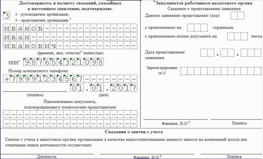 • Ниже заполняется ОГРН и дата, когда следует прекращать работу с ЕНВД: