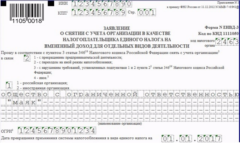 В России налоговая система имеет несколько видов налогообложения, один из них ЕНВД — Единый налог на вмененный доход. В том случае, когда руководство ООО решает прекратить работать по ЕНВД, следует отправиться в налоговую инспекцию и написать заявление об отказе. Далее рассмотрим заполнение формы ЕНВД-3 на примере образца.