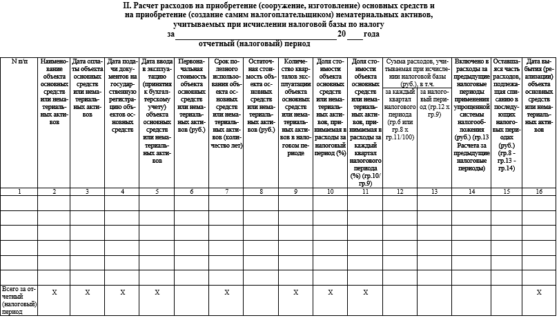 - Раздел II – отражает расходы, потраченные на приобретение основных средств и нематериальных активов, которые учитываются при налогообложении;
