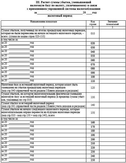 - Раздел III – отражает убыток предпринимателя, полученный в предыдущем налоговом периоде;