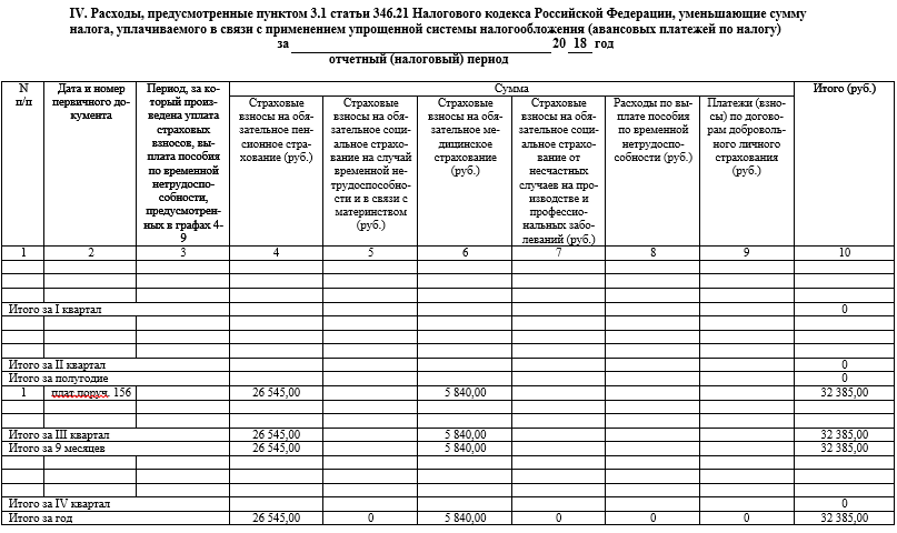- Раздел IV- отражает сумму уплаченных страховых взносов, больничных пособий (пункт 3.1 статьи 346.21 НК РФ);