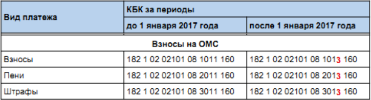 В качестве примера, приведем часть таблицы, где указаны коды, которые использовались до начала 2017 года, которые должны применяться сейчас, а также КБК ФФОМС ИП за себя.